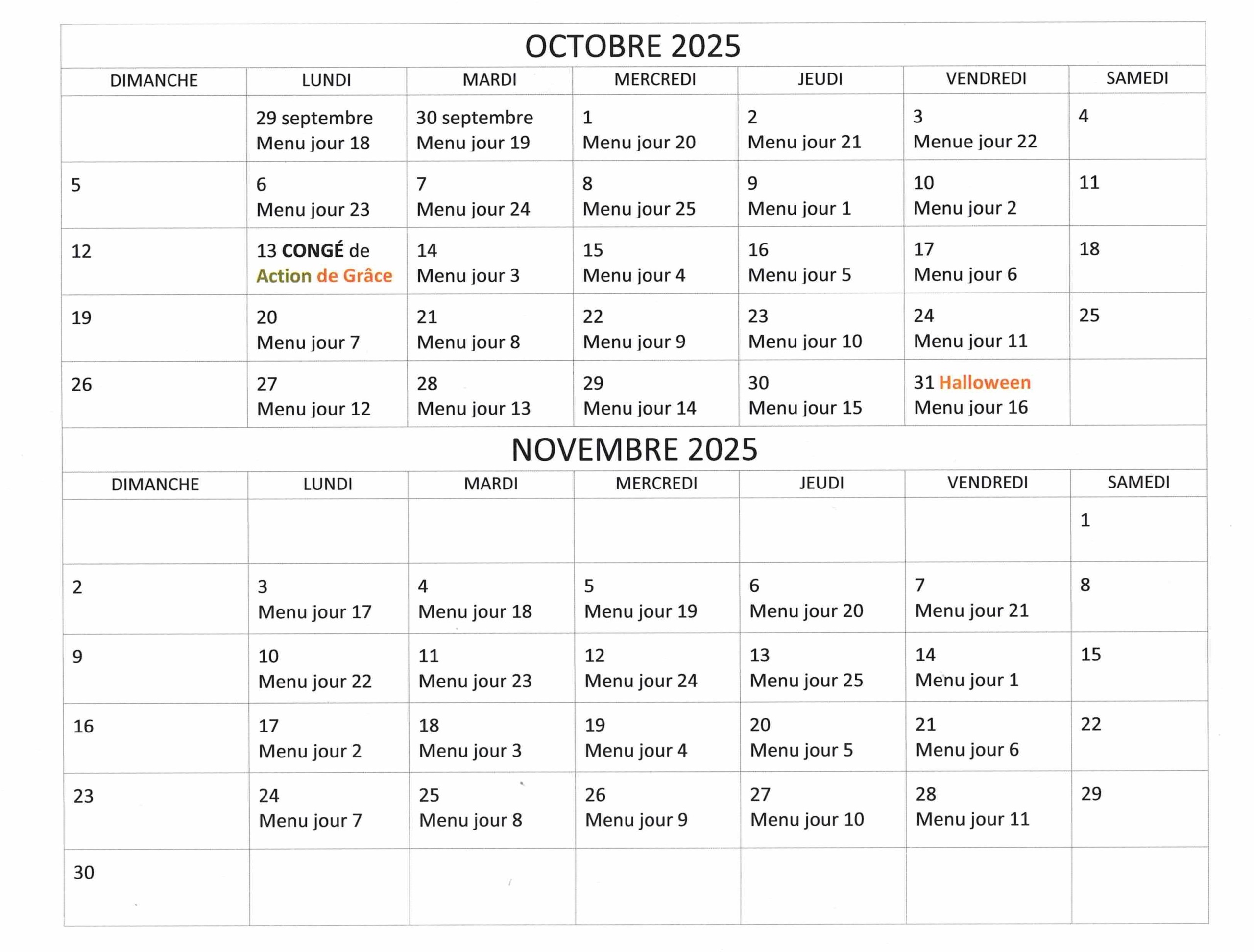 Les repas sont offerts selon les forfait ici-bas énumérés et incluent un repas de 4 services, soit un choix d’entrées (potage, salade ou crudités), un choix de repas principal (voir menu ci-joint), un choix de dessert, un choix de breuvage (thé, café, lait ou eau) ainsi qu’un choix de collations en matinée et en après-midi (fruit frais, yogourt, muffins, barres tendres maison, etc.).